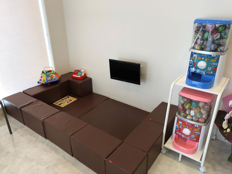 ほりぐちファミリー歯科のキッズルーム 待ち時間も退屈せず、楽しく過ごせます。 また治療を頑張ったり、検診やクリーニングに来た子には当医院オリジナルのガチャガチャもできます。